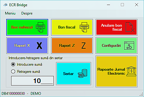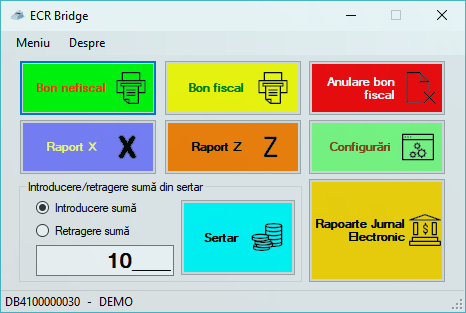 EcrBridge este un driver fiscal care vă permite generarea bonurilor fiscale prin intermediul unui calculator care folosește un sistem software de vânzare. Este compatibil cu orice aplicație de vânzare - gestiune existentă. Programul de vânzare-gestiune generează un fișier cu extensia *.txt pe care driver-ul nostru îl interpretează și îl furnizează mai departe echipamentului fiscal, eliminând riscul erorilor sau al blocărilor.