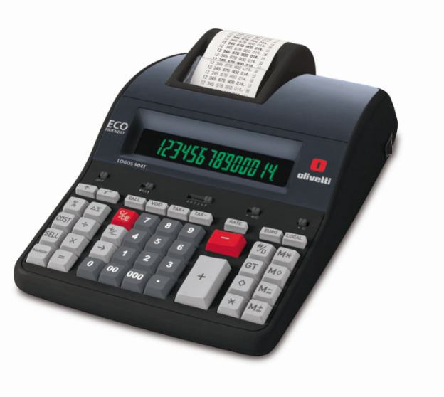 Calculatorul de birou cu banda LOGOS 904T Olivetti destinat utilizarii profesionale este prevazut cu o imprimanta termica alfanumerica silentioasa si rapida (10l/sec)  si un afisaj mare, retroiluminat, de 14 digits, in 2 culori. Tastatura este antiseptica, capabila sa previna raspandirea de bacterii si micro-organisme daunatoare sanatatii. Permite calcularea de costuri, marje si preturi de vanzare, precum si calcul deviatie delta (%), taxe si functii mark-up/mark-down. Una dintre functiile Memoriei logice este optiunea de a salva diferite operatiuni ce permit astfel salvarea rezultatelor in memoria interna. Calcule precise si sigure.Specificatii tehnice:Display: LCD retroiluminat 14-digit, 2 culori, functie SALVARE Imprimanta: termica alfanumerica 2 culori (rosu/negru), silentioasa si rapida (10linii/sec)Functii: Calculatii cu salvare: Memorie logica, Cost, marja and calcul pret vanzare, Calculatie GRAN Total, Call and Void (corectie date), Calcul taxe si radacina patrata,Procent si calcul deviatie delta (%), Convertor Moneda, 4 operatiuni esentiale, functie Mod Hibernare Selectori: Alimentare pornita: da/nu, Rotunjire, 5/4, Zecimale A, 0, 2, 3, 4, FL, Contor Articole, Cu imprimare/Fara ImprimareAlimentare: La prizaDimensiuni (LxlxH): 205 x 320 x 87 mm