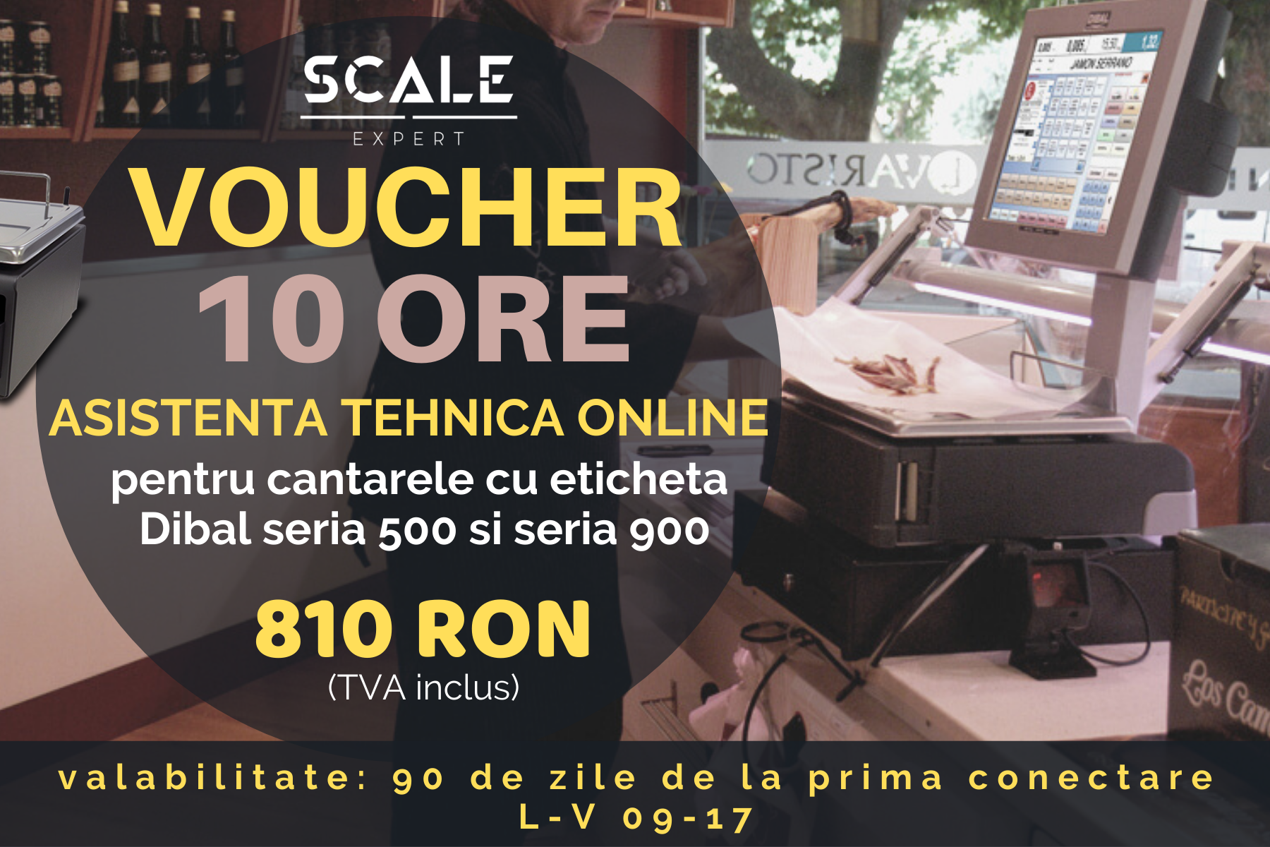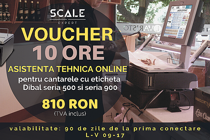 valabil pentru orice cantar cu eticheta seria 500 si seria 900 DIBALServicii executate : configurare eticheta programare articole modificari eticheta setare comunicare cantar - PC backup baza de date restaurare baza de date instruire operator valabilitate 90 zile de la prima conectare Luni - Vineri , 9.00 - 17.00