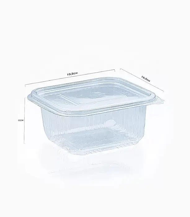 Caserole transparente cu capac atasat PET, 500 ML, 100 BUC/SET, 6 SET/BAX Caserola transparenta cu capac atasat perfecta pentru pastrarea si livrarea diferitelor alimente. Poate fi utilizata in magazine, patiserii, fast-food, firme de catering sau street food. Produsul are un sistem de inchidere etans, cu capac, pastrand astfel mâncarea proaspătă mai mult timp. Este rezistent la transport. Capacul are protectie anti-scurgere si protejeaza continutul, fiind ideal pentru transportarea mancarii si pentru pastrarea resturilor.