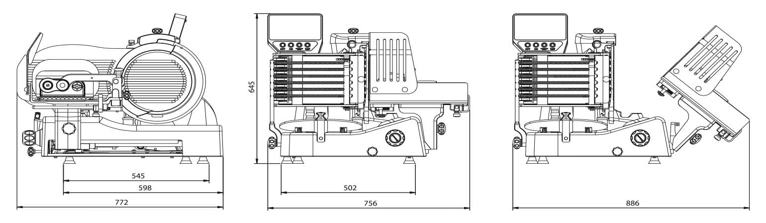 Feliator Profesional Kolossal Dual 330 VK FA – Automat și Manual Prezentare generală Noul Kolossal Dual 330 VK FA, complet automat, dar și cu posibilitate de operare manuală, aduce viitorul mai aproape și îmbunătățește prezentul. Datorită ecranului său tactil, poți seta și salva cu ușurință un program de feliere, verifica diagnosticul erorilor, accesa instrucțiunile de utilizare și întreținere, beneficia de conexiune Wi-Fi și personaliza configurația aparatului. Funcționarea sa automată, simplă și intuitivă, asigură o cantitate mare și precisă de felii de carne, salam sau brânzeturi, fără nicio intervenție a operatorului, garantând un nivel maxim de siguranță și igienă. Echipament Standard Cutie de viteze sau transmisie cu curea Mod automat și manual cu glisieră superioară Ascuțitor încorporat, orientat corect și ușor de utilizat Feliere automată optimizată, cu trei viteze ale căruciorului Cărucior rabatabil cu împingător ajustabil din aluminiu Precizie excelentă la feliere Înălțime redusă de încărcare, pentru a diminua efortul operatorului Design foarte compact, potrivit pentru spații restrânse Suprafețe din aluminiu ultra-netezite și lustruite Canale de alunecare precise, pentru a reduce frecarea și a simplifica curățarea Ascuțitor, apărătoare de lamă, deflector și placă detașabile, bară de ghidaj pentru produs, dispozitiv de stivuire și suport de depozitare – pentru o curățare ușoară Conformitate Europeană Directive Europene 2006/42/CE (Directiva mașini) 1935/2004/CE (Materiale în contact cu alimentele) 10/2011 UE (Materiale plastice pentru uz alimentar) 2006/95/CE (Directiva tensiune joasă) 2011/65/UE (Directiva RoHS) Standardele Europene EN EN 1974:1998 (Feliatoare – cerințe de igienă și siguranță) EN 60204-1 (Siguranța utilajelor) EN 55014 (Compatibilitate electromagnetică) și actualizările ulterioare Alte conformități Conform cu Directivele și Regulamentele Europene în vigoare Produs certificat pentru materiale în contact cu alimente (FCMs) Specificații Tehnice Kolossal Dual 330 VK FA SPECIFICAȚII TEHNICE – Kolossal Dual 330 VK FA Diametrul lamei 330 mm Viteza lamei 190–250 rpm Grosimea feliei 0,5 – 8 mm Cursa căruciorului 345 mm Protecție electrică IPX3 (Motor IPX5) Greutate netă 78,5 kg Specificații electrice 220–230V / 250Hz, 850 W, curent alternativ, monofazat Capacitate de tăiere Ø 180 mm – 250 × 180 mm Felii pe minut 30 / 40 / 50