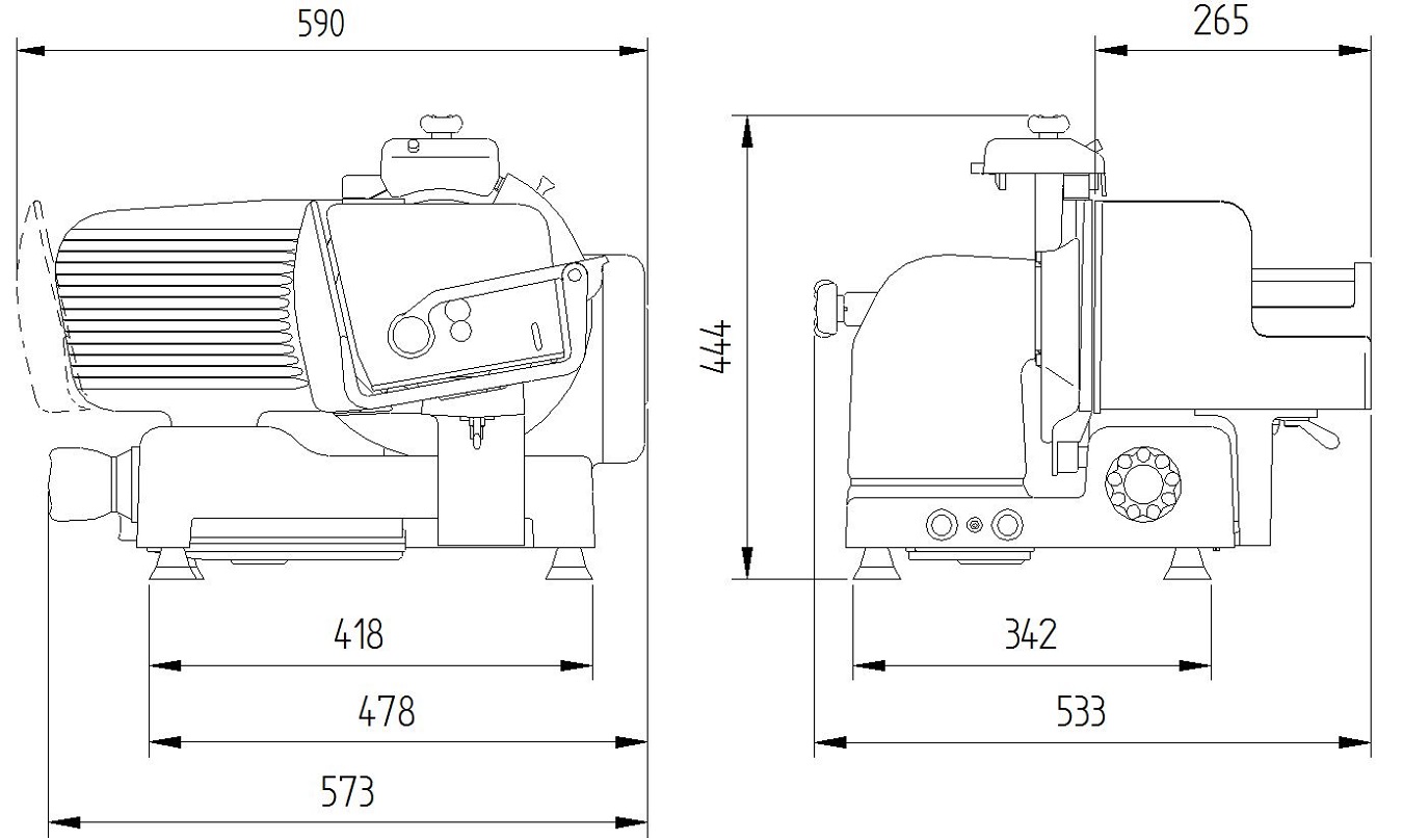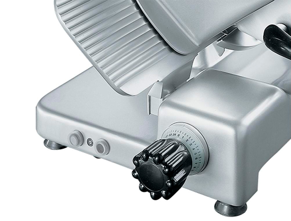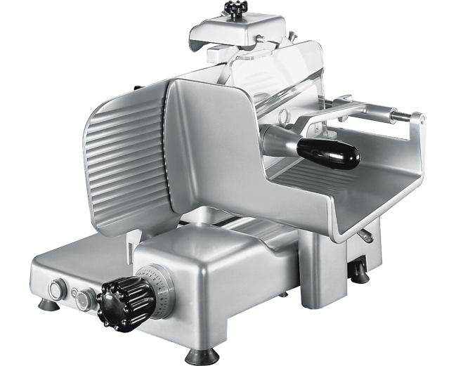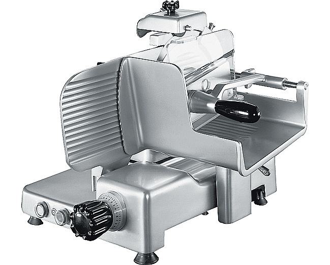 Echipare standard Transmisie cu cutie de viteze (gear box transmission) Ascuțitor integrat, ușor de utilizat, cu unghi de ascuțire corect Capacitate mare și precizie ridicată la feliere Înălțime redusă de încărcare, pentru diminuarea efortului operatorului Suprafețe din aluminiu foarte netede, polisate, și canale atent realizate pentru alunecare, care reduc frecarea și simplifică operațiunile de curățare Ocupare redusă a spațiului pe blat Ascuțitorul, apărătoarea lamei, deflectorul de produs și platoul de carne sunt detașabile pentru o curățare temeinică Conformitate și certificări În conformitate cu directivele europene: 2006/42/CE (Directiva Mașini) 1935/2004/CE (Directiva privind materialele în contact cu produsele alimentare) 10/2011 UE (Directiva privind materialele plastice pentru uz alimentar) 2006/95/CE (Directiva privind tensiunea joasă) 2011/65/UE (Directiva RoHS) Și standardele europene: EN 1974:1998 (Feliatoare – cerințe de igienă și siguranță) EN 60204-1 (Siguranța mașinilor – echipamente electrice ale mașinilor) EN 55014 (Compatibilitate electromagnetică) și actualizările ulterioare Echipament conform cu directivele și reglementările europene în vigoare. Produs certificat pentru FCMs (Food Contact Materials – materiale în contact cu alimentele). CARACTERISTICI TEHNICE 250 VK VE Dimensiuni generale 573 x 533 x 444 mm Suprafață de instalare 418 x 342 mm Zonă de lucru 590 x 533 x 444 mm Diametru lamă 250 mm Viteză lamă 200 rpm Grosime felie 0 – 24 mm Protecție electrică IPX3 (Motor IPX5) Greutate netă 28,5 kg Cursă cărucior 250 mm Specificații electrice 220–230V / 340W a.c. monofazat; 220–230V / 380–400V / 230W a.c. trifazat Capacitate de tăiere Ø 170 mm – 207 x 155 mm