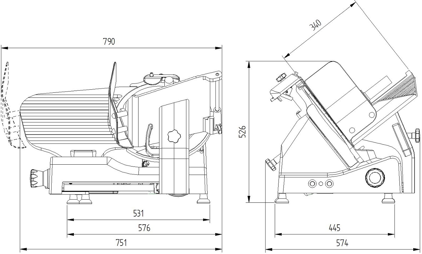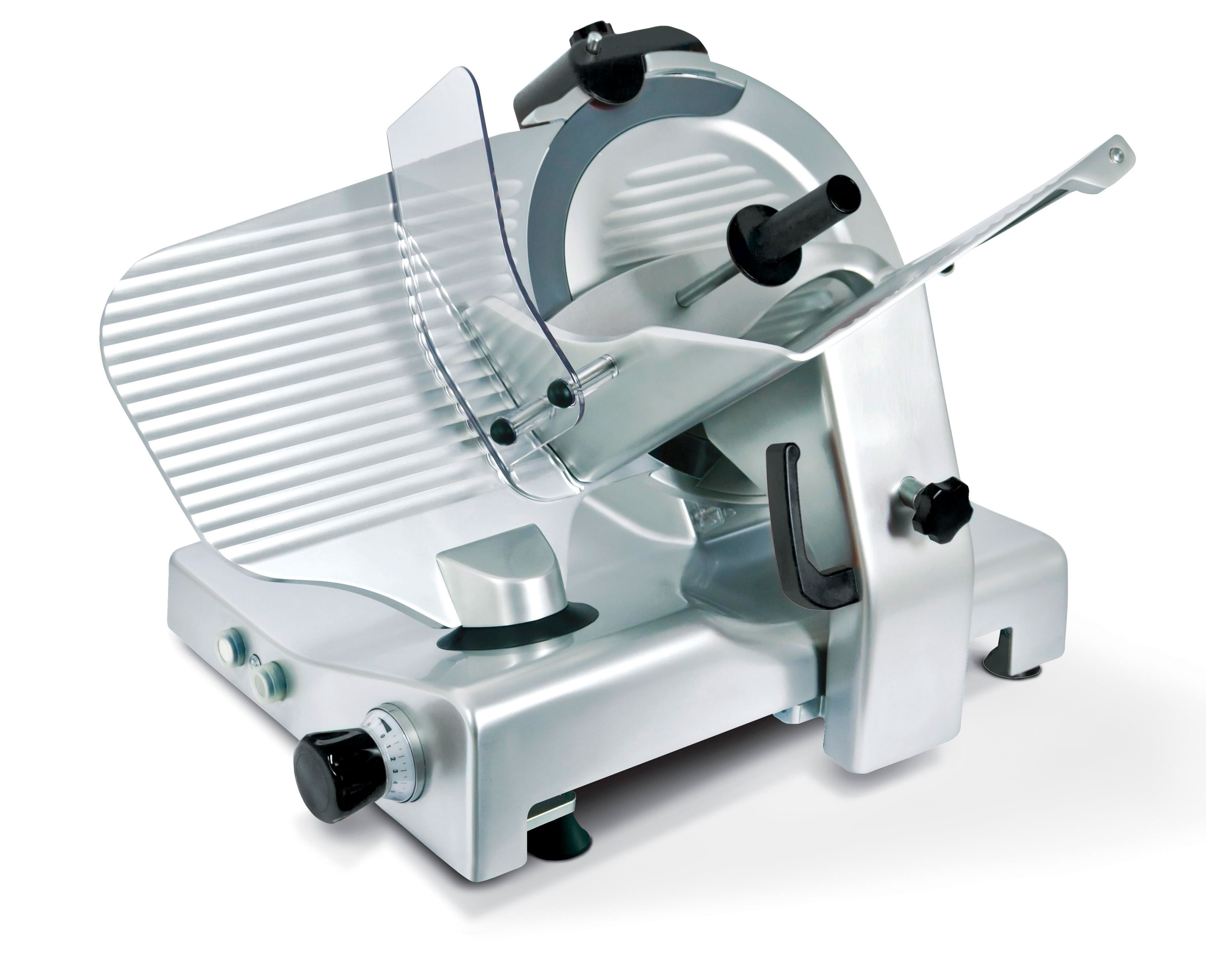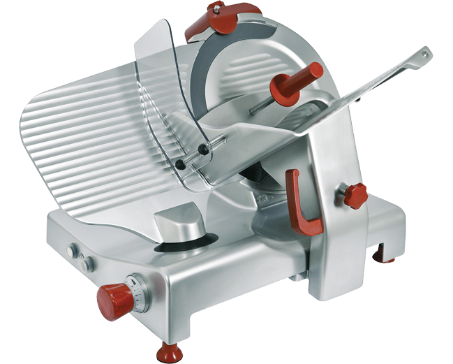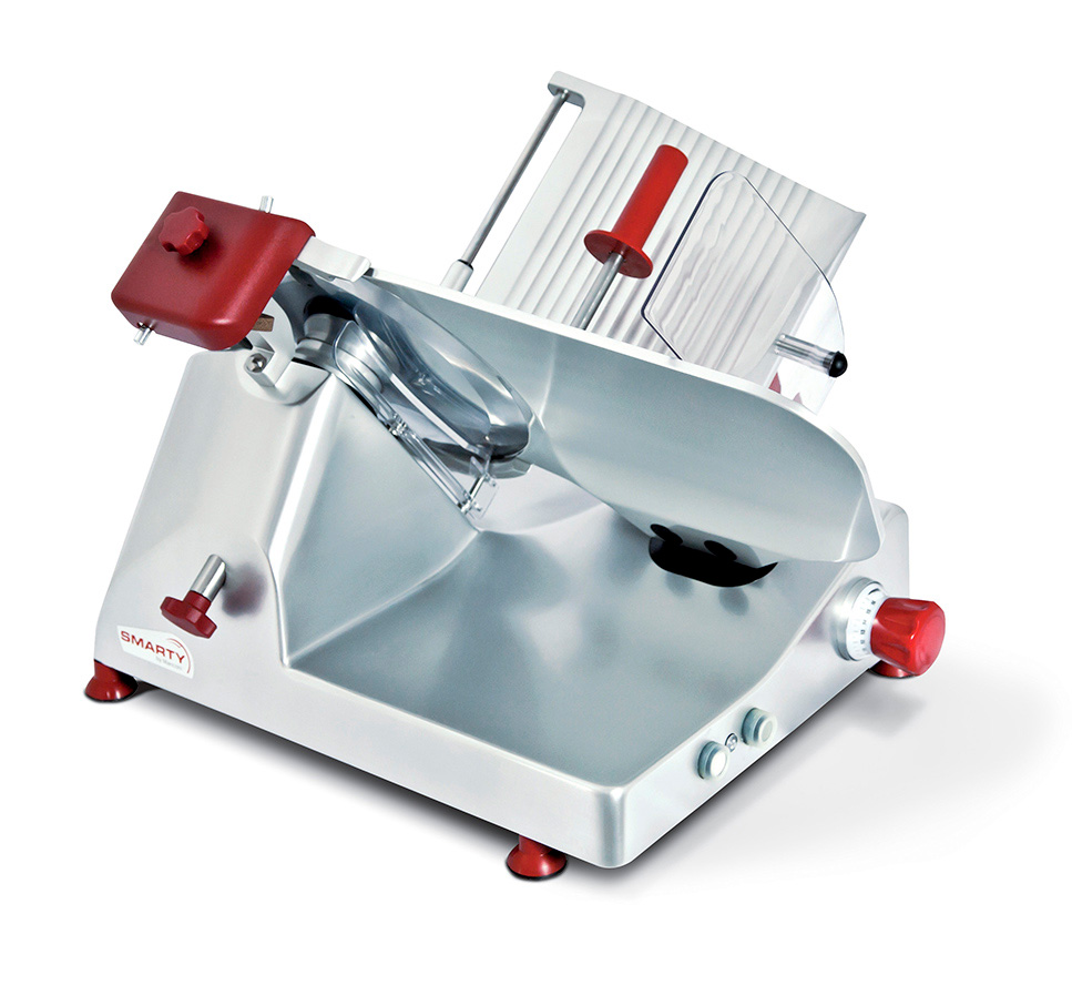 Echipare standard – Feliator Smarty 350 IX Transmisie prin curea Ascuțitor încorporat, ușor de utilizat Precizie excelentă la feliere Înălțime redusă de încărcare pentru a diminua efortul operatorului Lama din oțel inoxidabil 100Cr6 (standard) Placă detașabilă Sanie cu împingător din aluminiu Suprafață de contact redusă cu blatul (opțional)Conform cu directivele europene:2006/42/CE (Directiva Mașini) 1935/2004/CE (Materiale pentru contact cu alimentele) 10/2011 UE (Materiale plastice pentru uz alimentar) 2006/95/CE (Directiva Tensiune joasă) 2011/65/UE (Directiva RoHS) și standardele europene: EN 1974:1998 (Feliatoare – cerințe de igienă și siguranță), EN60204-1 (Siguranța mașinilor), EN 55014 (Compatibilitate electromagnetică) și actualizările ulterioare. Ascuțitorul, capacul lamei și deflectorul pentru felii sunt detașabile pentru o curățare ușoară Canale de alunecare perfect finisate pentru o mișcare mai performantă Disponibil și cu componente din plastic negru Conform cu directivele și reglementările europene actuale Produs certificat FCM (Materiale pentru contact alimentar)OPTIONAL P6 Verificare greutate Specificații tehnice CARACTERISTICI TEHNICE – 350 IX CARACTERISTICI TEHNICE – 350 IX Caracteristici Valoare Dimensiuni totale 751 × 574 × 526 mm Suprafață de instalare 531 × 445 mm Diametru lamă 350 mm Viteză lamă 230 rot/min Grosime felie 0 – 16 mm Cursă sanie 361 mm Protecție electrică IPX3 Greutate netă 42 kg Specificații electrice 230–230V 50 Hz / 380W a.c. monofazat; 220–230V, 380–400V / 375W a.c. trifazat Capacitate de tăiere Ø 252 mm – 300 × 225 mm