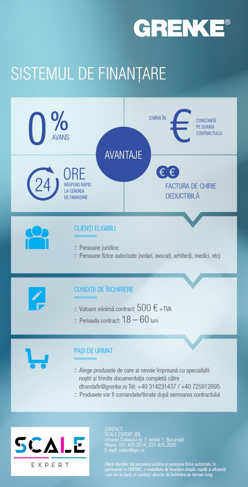 Impreuna cu partenerul nostru, GRENKE, oferim clientilor nostri, persoane juridice si persoane fizice autorizate, solutia potrivita de finantare in rate, simpla, rapida si eficienta pentru achizitionarea echipamentelor necesare dezvoltarii businessului.