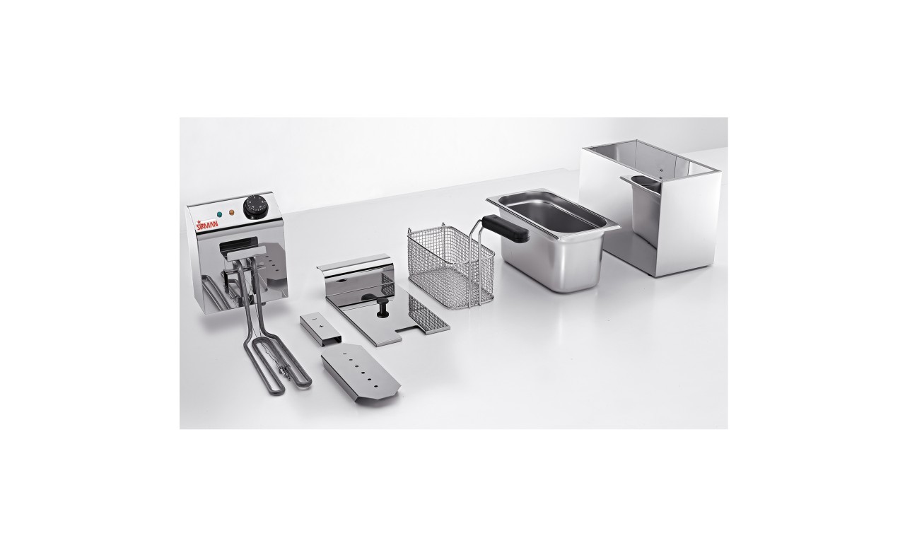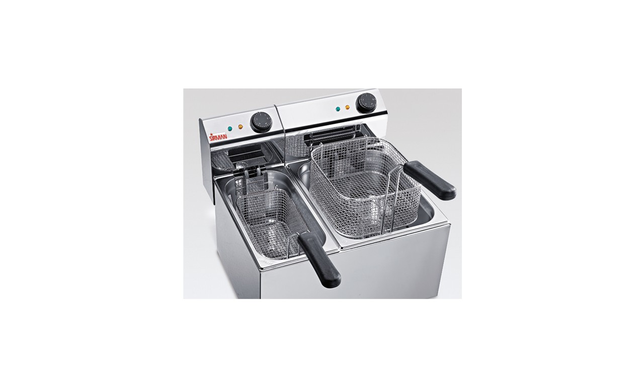 Friteuzele electrice profesionale de la Sirman Italia sunt fabricate din inox şi echipate cu coș ranforsat, termostat și sondă de siguranță cu buton de resetare, rezistenţe cu protecție la șocuri, corp de încălzire detașabil cu buton de siguranță, protecție anti-șoc la rezistențe ușor demontabile, capac inclus, robinetul este opţional. Friteuza electrică profesională dublă model Eldorado 5x2 are o capacitate a cuvei de minim 1.8 - maxim 3.2 (x2) litri, cu următoarele dimensiuni: 220x120 h.100mm (x2). Detalii produs Putere electrică: 5.4 kWAlimentare: Curent electric 230V / 50Hz / 1NCapacitate: 3.2 litri + 3.2 litriInterval temperaturi: +50/+190°CGreutate: 12 kgLungime: 360 mmLățime (Adâncime): 420 mmÎnălțime: 360 mmMaterial: InoxSistem de comandă: ElectromecanicNumăr cuve: 2