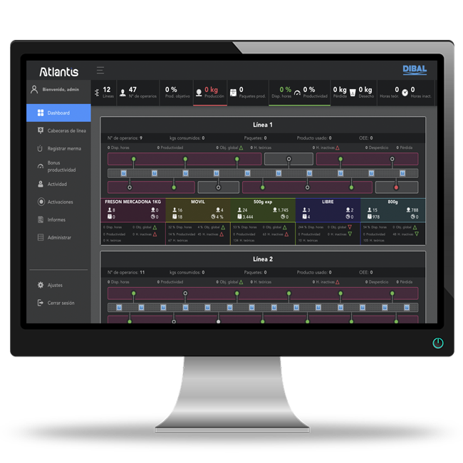 Software pentru controlul productivității în indicatoarele de greutate VT-600 cu structura PC Aplicație pentru controlul productivității in industria alimentară. Pentru intreprinderile din industria alimentara în care ambalarea manuală face parte din proces, în sectorul fructelor și legumelor și al conservelor, este de o importanță vitală să se asigure că fiecare ambalaj conține cantitatea stabilită de produs în limitele definite, atât pentru a evita oferirea unui produs care nu atinge greutatea țintă, cât și pentru a evita depășirea greutății țintă și suportarea pierderilor. Ca răspuns la această nevoie, Dibal a dezvoltat soluția de control al productivității. Funcţii Identificarea lucrătorului. Identificarea lotului. Identificarea articolului. Cântărirea articolului și înregistrarea informațiilor. Operatie specifica de umplere si control al greutatii variabile a produsului. Sistem de operare Linux. Echipamente compatibile Seria VT-600 de indicatoare de greutate.