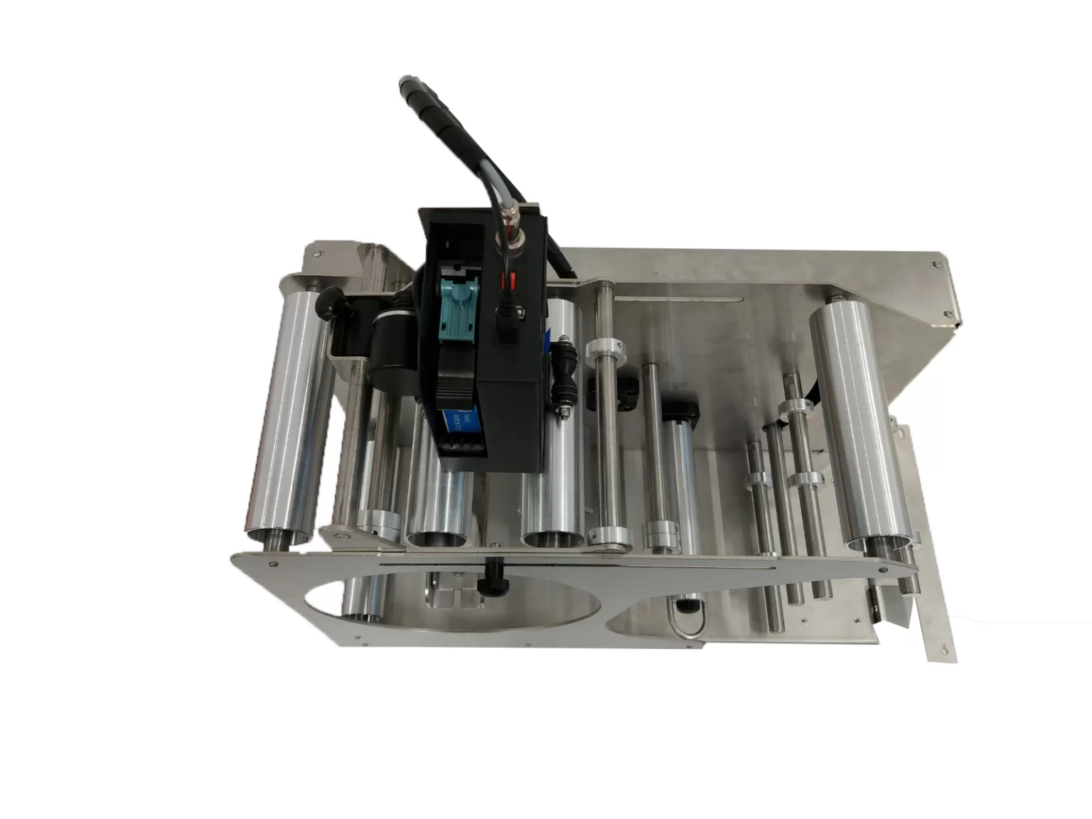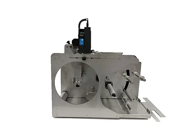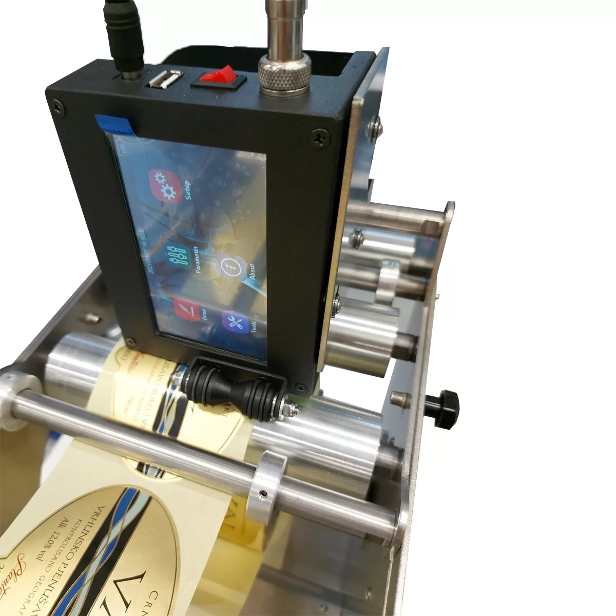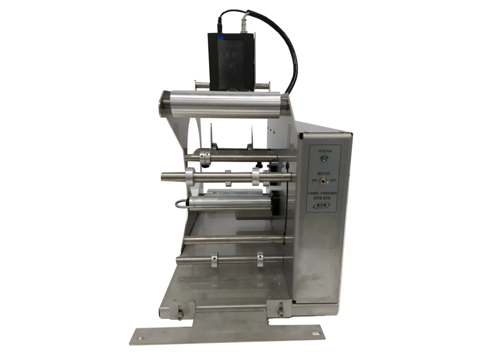 Cu STS815 poți imprima informații variabile chiar înainte de aplicarea etichetei pe produs. Modulul de marcare STS815 poate fi conectat la orice mașină de etichetare din oferta noastră, ceea ce îți permite să aplici eticheta imediat după imprimare. Rola de etichete este plasată în partea din spate a modulului STS815, iar banda de etichete trece la mașina de etichetare. Imprimanta este ușor de utilizat și oferă o impresie de durată. Software-ul imprimantei include șabloane predefinite pentru coduri de bare, coduri QR, dată și alte date, care pot fi ușor modificate pentru a se potrivi nevoilor tale.Caracteristici & SpecificatiiDimensiuni: 280 mm (l) x 550 mm (h) x 520 mm (a)Diametru recipient: n/aLungime recipient: n/aDiametru rolă etichete: < 200 mmDiametru interior rolă: 76 mmAlimentare electrică: 100 – 240 Vac, 50 – 60 HzConectare electrică: Cablu tip SHUKOConsum propriu: < 100 VALățime etichetă / rolă: 25 – 150 mmLungime etichetă: 25 – 500 mmSpațiu între etichete: > 2.5 mm (recomandat 4 mm)Viteză bandă: n/aGreutate: 21 kgCuloare: Gri (metalizat)