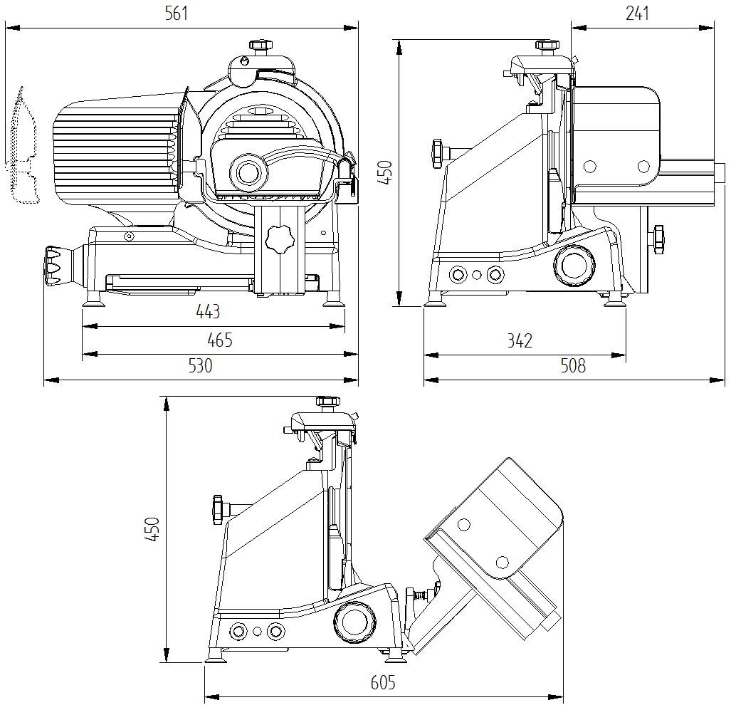 Feliator profesional Smarty 250 VX VE Echipare standard Echipare standard Transmisie prin curea Ascuțitor încorporat, ușor de utilizat Precizie excelentă la feliere Înălțime redusă de încărcare pentru a diminua efortul operatorului Sanie cu împingător oscilant și ascuțitor Suprafață redusă de contact cu blatul Ascuțitorul, capacul lamei și deflectorul pentru felii sunt complet demontabile pentru o curățare ușoară Conform cu directivele europene: 2006/42/CE (Directiva Mașini) 1935/2004/CE (Materiale pentru contact cu alimentele) 10/2011 UE (Materiale plastice pentru uz alimentar) 2006/95/CE (Directiva Tensiune joasă) 2011/65/UE (Directiva RoHS) și standardele europene: EN 1974:1998 (Feliatoare – cerințe de igienă și siguranță), EN60204-1 (Siguranța mașinilor), EN 55014 (Compatibilitate electromagnetică) și actualizările ulterioare. Canale de alunecare perfect finisate pentru o mișcare mai performantă Sanie rabatabilă Disponibil și cu componente din plastic negru Conform cu directivele și reglementările europene actuale Produs certificat FCM (Materiale pentru contact alimentar) Specificații tehnice CARACTERISTICI TEHNICE – 250 VX VE CARACTERISTICI TEHNICE – 250 VX VE Caracteristică Valoare Dimensiuni totale 530 × 508 × 450 mm Suprafață de instalare 443 × 342 mm Diametru lamă 250 mm Viteză lamă 286 rot/min Grosime felie 0 – 16 mm Cursă sanie 245 mm Protecție electrică IPX3 Greutate netă 20 kg Specificații electrice 230–230V 50 Hz / 210W a.c. monofazat; 220–230V, 380–400V / 270W a.c. trifazat; 120V 60 Hz / 210W a.c. monofazat Capacitate de tăiere Ø 180 mm – 215 × 165 mm