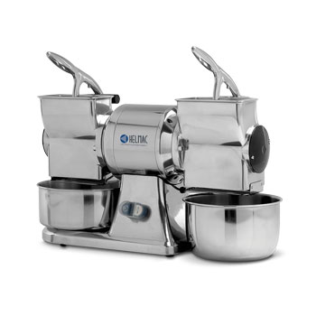 Razatoare electrica profesionala pentru branza maturata 70 kg/ora, dubla GDH - HELMAC Răzătoare electrica profesională dubla ideala pentru profesioniștii din industria alimentară, deoarece permite utilizarea simultană a celor două răzătoare pentru produse diferite, garantând performanțe excelente pentru toate activitățile care vizează o înaltă calitate în prepararea alimentelor. Răzătoare electrica profesională din aliaj de aluminiu anodizat și inox, ideala pentru a răzui cantități mari de brânză tare tip parmezan, pesmet, nuci și biscuiți. Echipata cu gratar de protecție din oțel inoxidabil, pentru a preveni contactul cu piesele în mișcare si motor ventilat cu protecție termică. Comutatorul este protejat de o membrană de cauciuc din latex. Răzătoare electrice profesionale, ideale pentru diverse utilizări în cantine, laboratoare alimentare, supermarketuri și hipermarketuri pentru a procesa parmezan, brânză maturata, pesment, nuci și biscuiți. Procesare compactă, rapidă, sigură și ușor de intretinut si curatat. Productivitate: 70 kg/h Numar de rotatii: 1400 rpm Dimensiuni gura de razuire (wxd) 140x80 mm Putere 0.75 kW (1 CP) Greutate 21 kg Dimensiuni (wxdxh) 540x220x380 mm Alimentare: Trifazica 400 V / 50 Hz; Monofaziza 230 V / 50 Hz Producator: HELMAC Italia